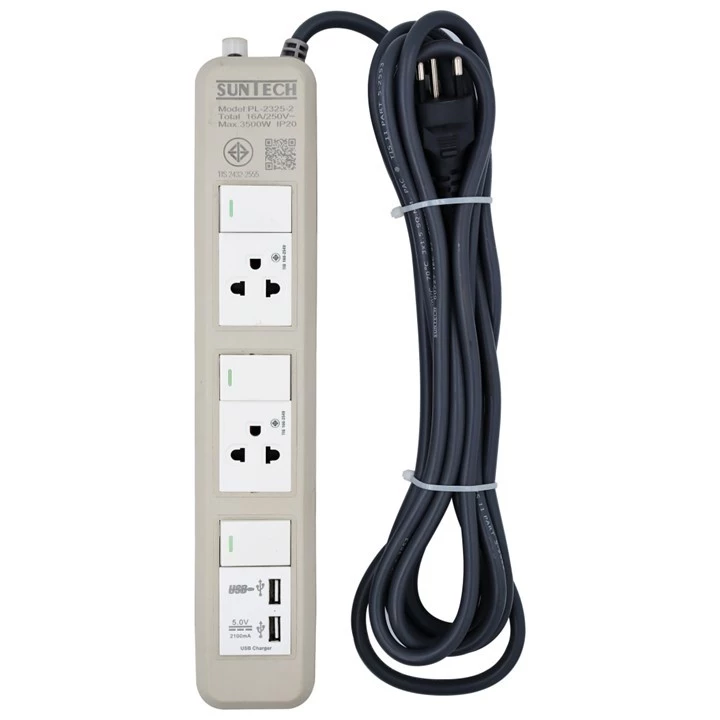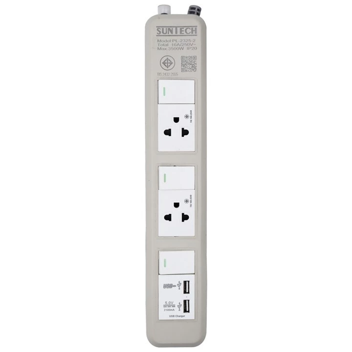• SUNTECH ชุดปลั๊กพ่วง มอก. PL 3 สวิตซ์ 2 ช่อง 2 USB 16A 3500 วัตต์ ขนาดสายไฟ 1.5 Sq.mm ยาว 3 , 5 เมตร